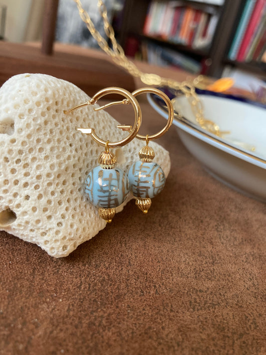 Golden Interchangeable Huggies Earrings with Hand Painted Ceramic Ancient Character of Long-Life Ceramic Beads