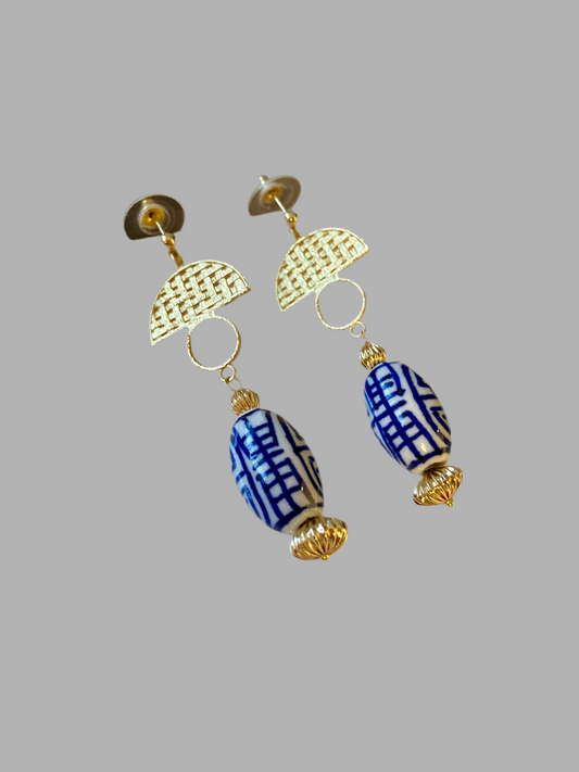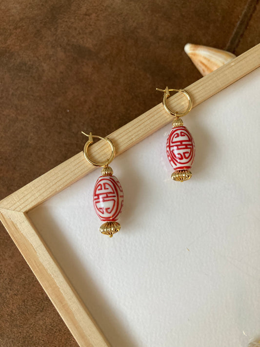 Gwen•Statement Golden Stud Earrings with Hand Painted Ceramic Ancient Character of Long-Life Beads
