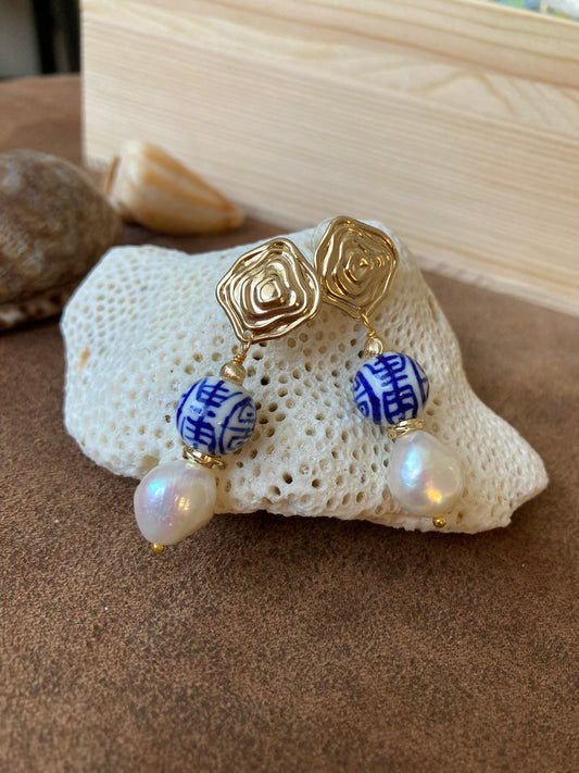 Statement Golden Stud Earrings in Freshwater Pearl & Hand Painted Ancient Character of Long-Life Ceramic Beads