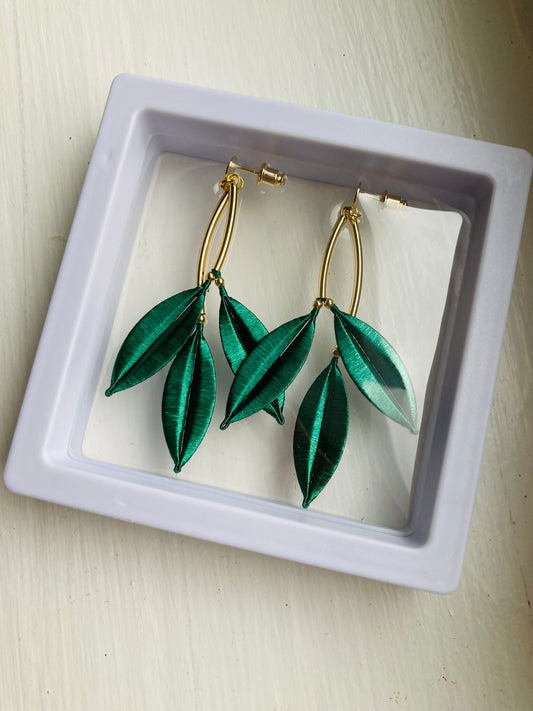 Statement Golden Hand-wrapped Silky Green Leaf Floral Earrings
