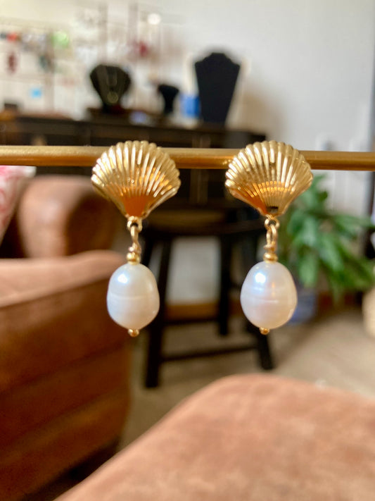 Golden Shell Stud Freshwater Pearl Contemporary Design Everyday Earrings