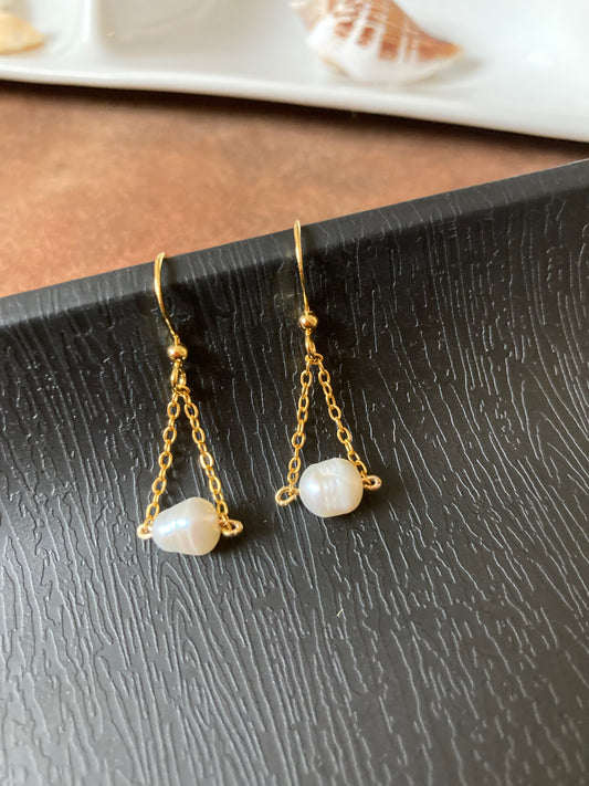 Lynn T• Freshwater Pearl Modern Geometric Design Golden Dangling Earrings
