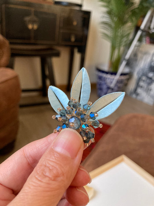 Drawing inspiration from centuries-old folk handicrafts and featuring hand-wrapped silky thread flowers. In ancient China, folk artisans used mulberry silk naturally dyed to make headdresses exclusively for royalty through the handcrafts handed down generations. Each piece of the leaves are hand-wrapped with shiny silky threads. More interesting is you may gently twist the leaves in the shape you like occasionally.