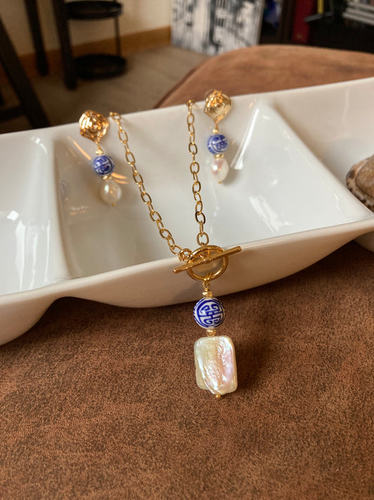 Set-Statement Golden Baroque Pearl Necklace & Stud Earrings Set with Hand Painted Ancient Chinese Character of Long-Life Ceramic Beads